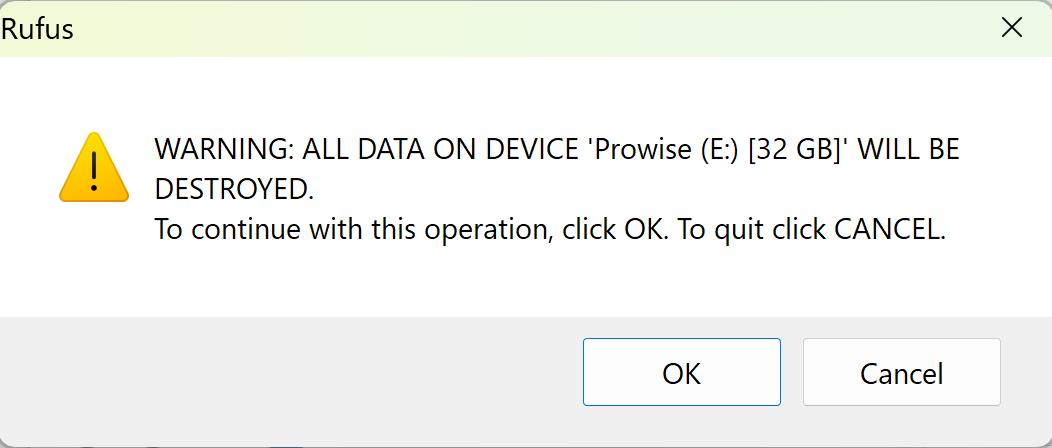 Rufus affichera un message d’avertissement indiquant que toutes les données présentes sur la clé USB sélectionnée seront détruites :