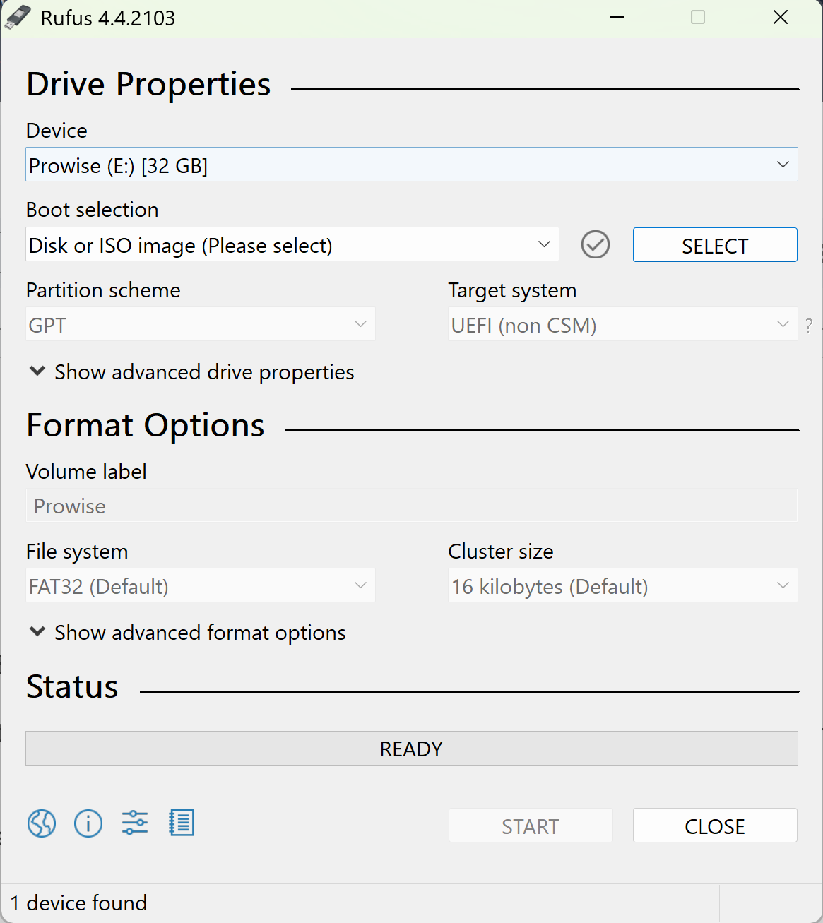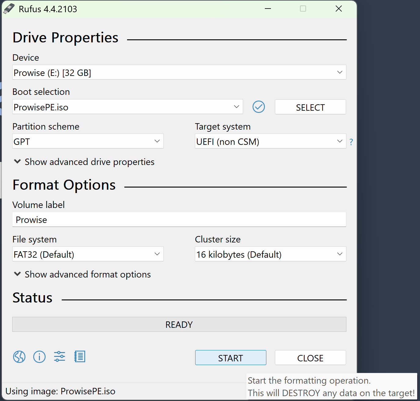 Étape 6 : Une fois que Rufus a terminé d’écrire ProwisePE sur votre clé USB, la barre d’état deviendra verte et affichera le texte « PRÊT »