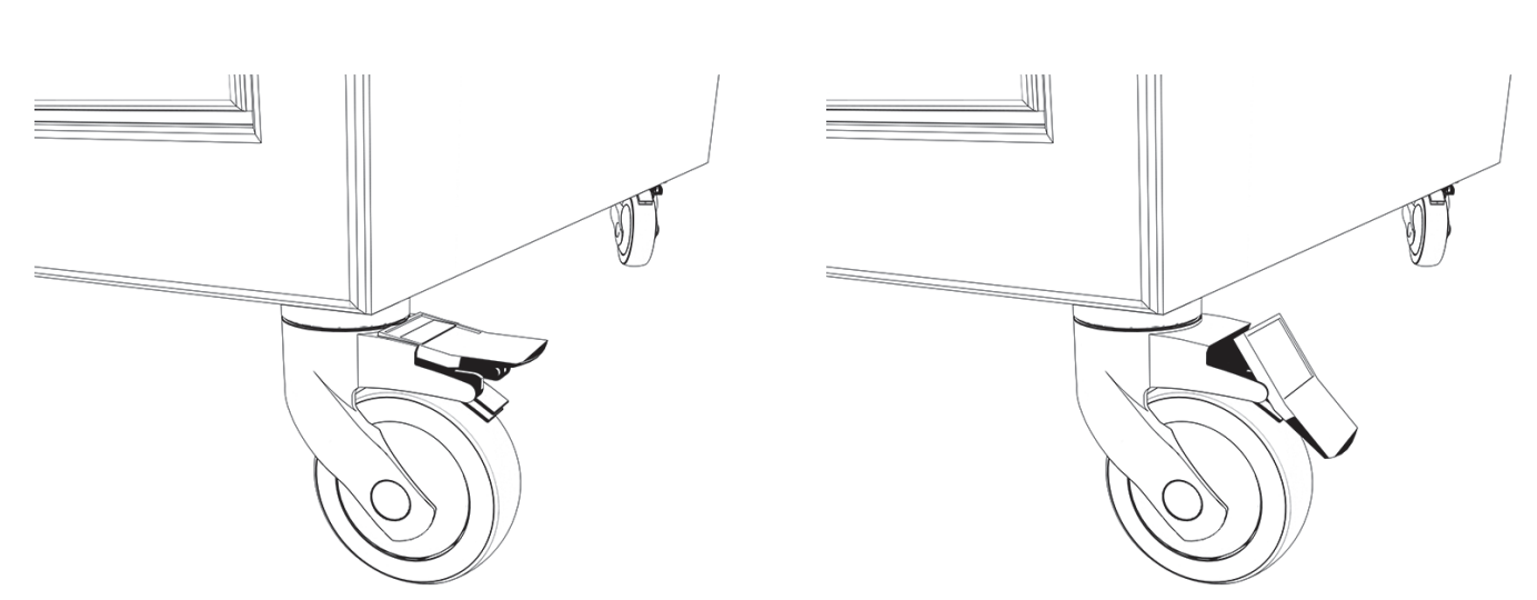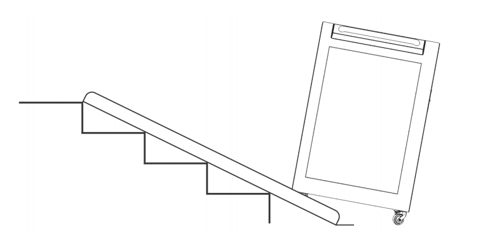 Le chariot de charge est équipé de roulettes pivotantes pour faciliter le déplacement. Saisissez le chariot de charge par les poignées pour le déplacer. Le chariot de charge est lourd (85 kg), ne soulevez pas le chariot pour éviter les problèmes physiques. Ne tentez jamais de déplacer le chariot de charge sur des escaliers. Utilisez toujours un ascenseur ou une rampe.