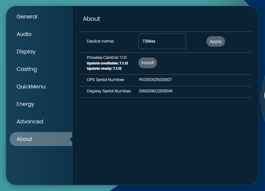 - Open het instellingenmenu van Prowise Central.