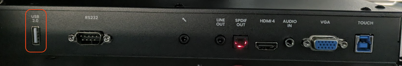 Sluit de USB stick aan op de USB 2.0 poort aan de linkerzijde (achterkant) van het scherm: