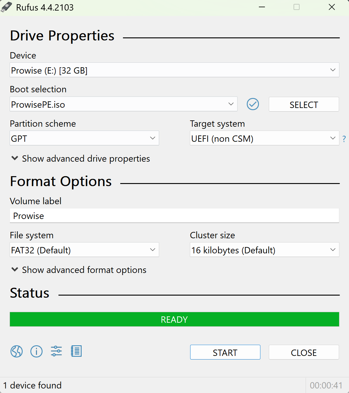 Stap 6: Zodra Rufus het schrijven van ProwisePE op je USB-stick heeft voltooid, wordt de statusbalk groen en verschijnt de tekst “READY”